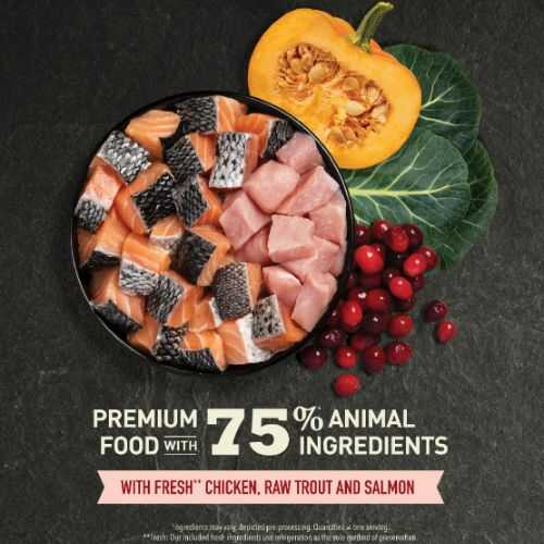 В состав входит: свежая курятина 11%, сырой лосось 9%, сырая форель 9%, курица дегидратированная 9%, минтай дегидратированная 9%, дегидратированная сельдь 9%, овощи, фрукты, травы и прочее; без злаков