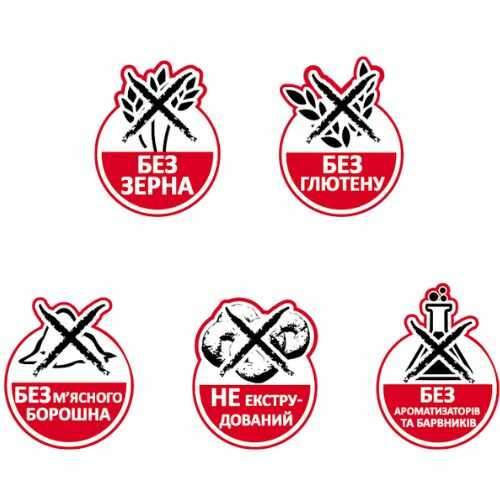 В состав входит: курица 35%, говядина 20%, индейка 20%, свиная печень 5% и прочее; без злаков, глютена, мясной муки, экструзии, ароматизаторов и красителей