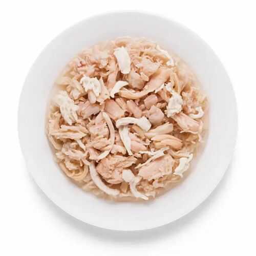 В состав входит: куриная грудка 65%, филе сибаса 10%, куриный бульон 24%, картофель 1% (мелко нарезанные кусочки в бульоне в консервной банке