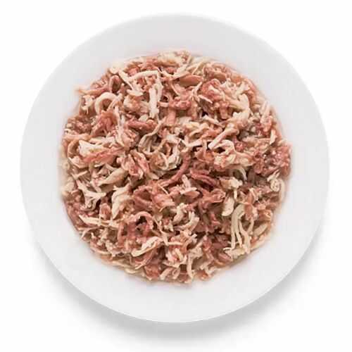 До складу входить: куряча грудка 65%, філе лосося 10%, курячий бульйон 24%, картопля 1% (дрібно нарізані шматочки в бульйоні у консервній банці)