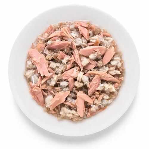 До складу входить: філе тунця 65%, філе лосося 10%, бульйон з тунця 24%, картопля 1% (дрібно нарізані шматочки в бульйоні у консервній банці)