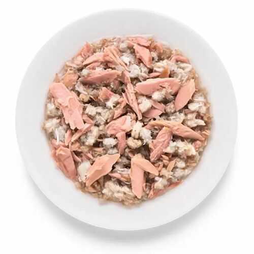До складу входить: філе тунця 65%, філе краба 10%, бульйон з тунця 24%, картопля 1% (дрібно нарізані шматочки в бульйоні у консервній банці)