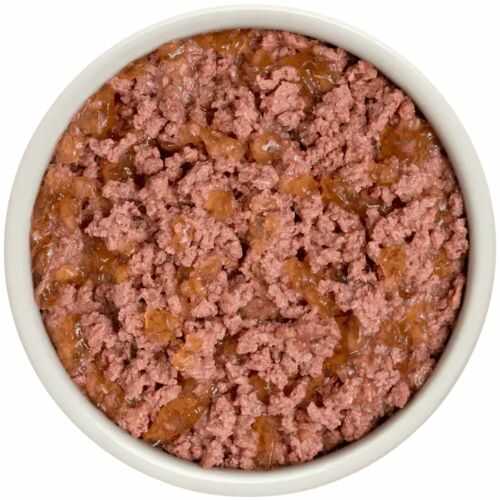 До складу входить: яловичина 35%, індичка 35%, солодка картопля 3,5%, мінерали, глюкозамін 0,1% (фаршеподібна консистенція у консервній банці)